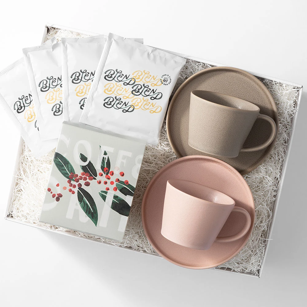 〈オニバスコーヒー〉のドリップバッグは、器具を使わず手軽に本格的な味わいを楽しめるのが魅力。焙煎から抽出まで丁寧に仕上げられたコーヒーの豊かな香りと味わいを、アーティストデザインの愛らしいパッケージに詰め込んでいます。〈サクザン〉の器とも相性がよく、統一感のある美しいギフトとして仕上がっています。