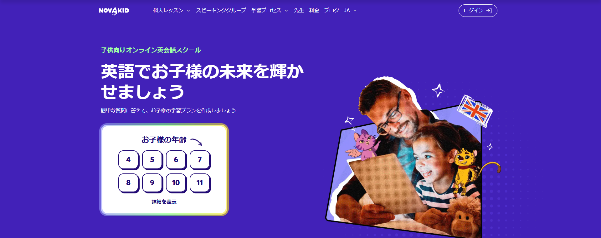 【Novakid(ノバキッド)】は、世界中で利用されている子供専門のオンライン英会話サービス。ゲーム感覚で楽しく学びながら、自然と英語で「考え」「話す」力を育てるカリキュラムが特徴です。