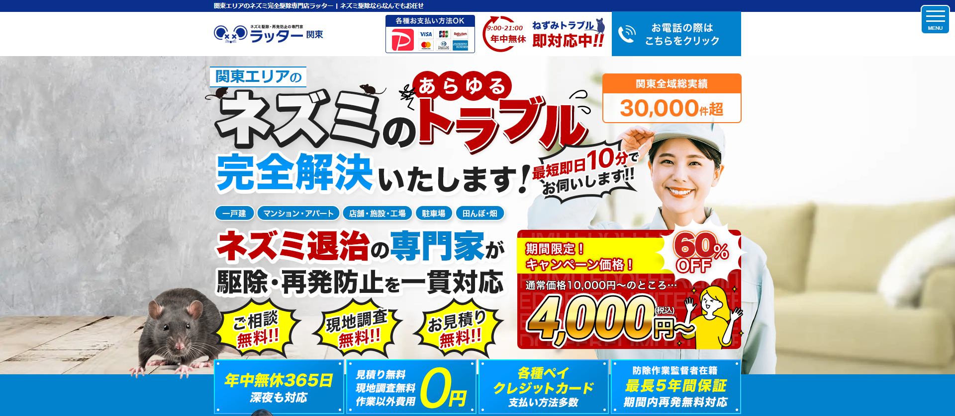 ネズミ退治専門【ラッター】は、現地調査から駆除、侵入経路の封鎖、衛生対策までトータルで対応するネズミ駆除サービスです。